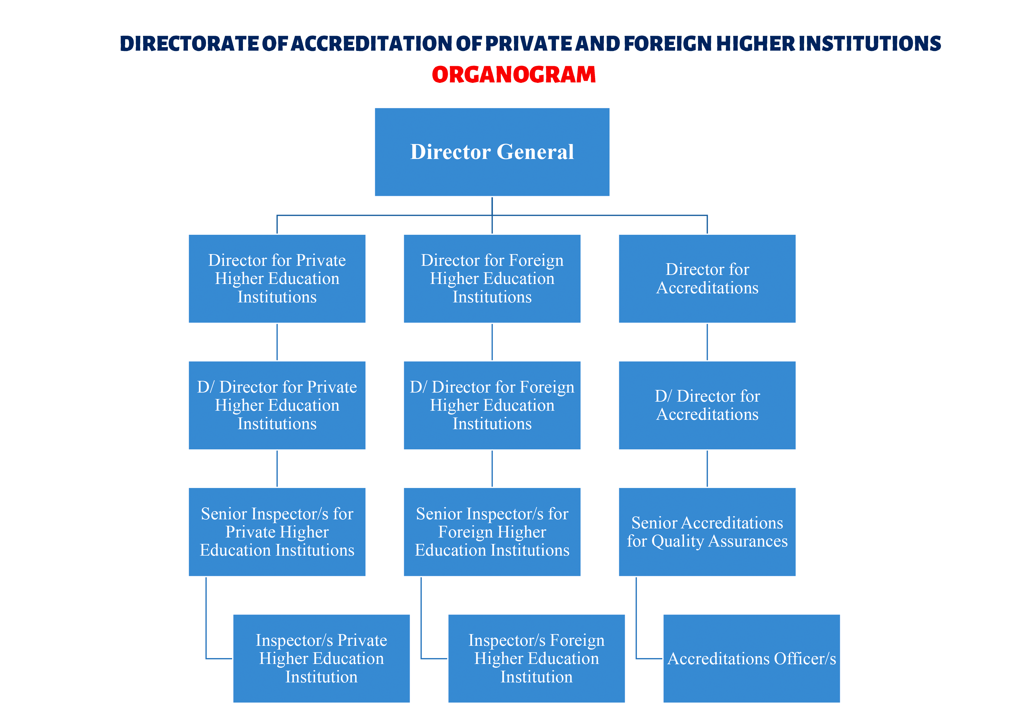 Directorate of Accreditation of Private and Foreign Higher Institutions: The directorate is mandated to promote quality assurance of investing private sector in higher education. The Directorate consist of the